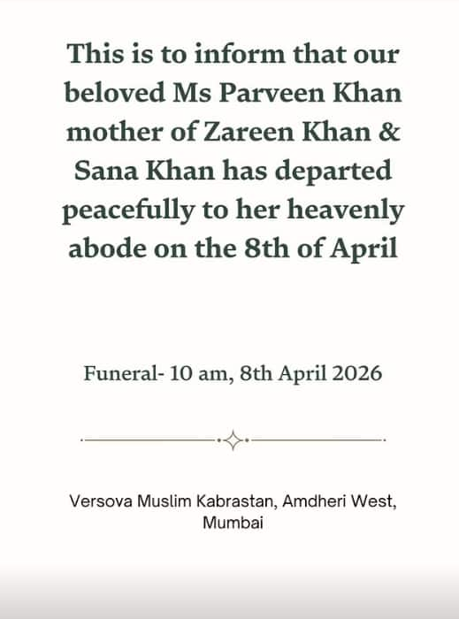 जरीन खान पर टूटा दुखों का पहाड़, 65 साल की उम्र में मां परवीन खान का हुआ निधन, काफी टाइम से थी बीमार