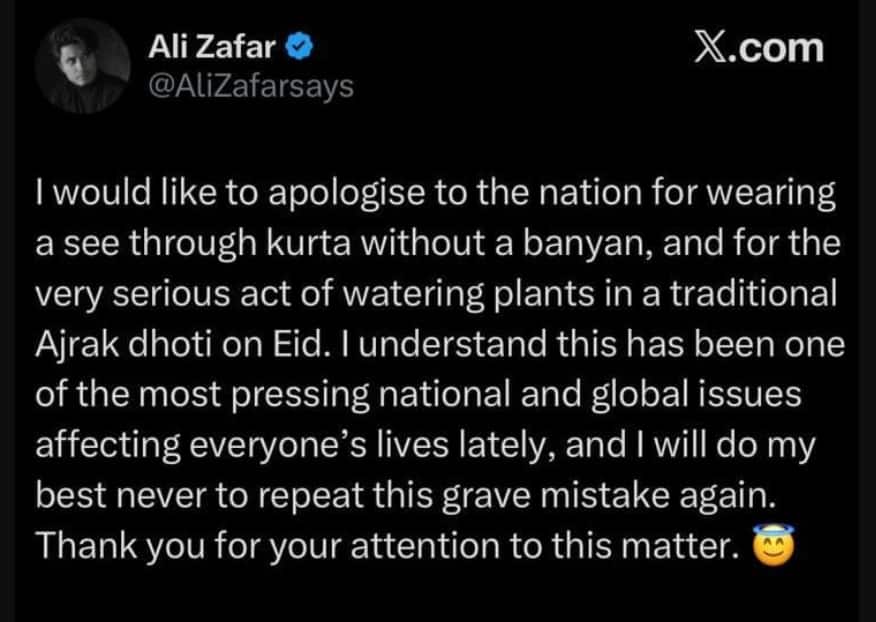 अली जफर ने पोस्ट कर लिखा- मैं देश से माफी मांगता हूं कि मैंने ईद पर बिना बनियान के कुर्ता पहना और धोती पहनकर मैंने पौधों को पानी दिया. मैं समझ सकता हूं कि ये नेशनल और ग्लोबल ईश्यू  है और लोगों कीजिंदगी को इफेक्ट कर रहा है. मैं ये पूरी कोशिश करूंगा कि ऐसी गलती फिर से न हो. इस मामले पर आप लोगों ने ध्यान दिया उसके लिए थैंक्यू.